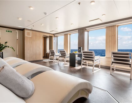 Wellness zařízení, jako jsou lázně, sauna, bazén, vířivky a venkovní běžecká dráha, umožňují hostům zregenerovat se během polární expedice. Krásně navržená restaurace a prostorné salonky jsou ideálním místem, kde se hosté mohou scházet a živě diskutovat o objevích daného dne.