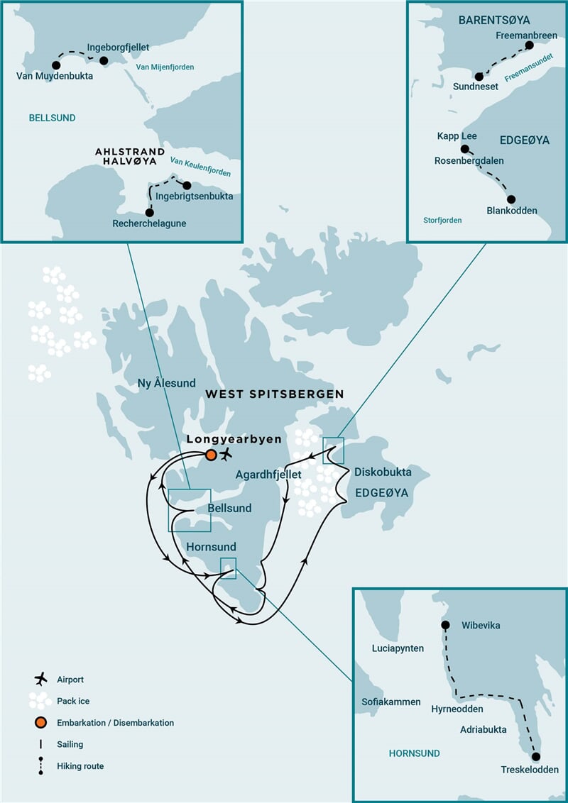 Dlouhá túra - Pokud to podmínky dovolí, přistaneme v Barentsøya u malých jezer s divokým ptactvem a brodivými ptáky a pak se vydáme na východ podél pobřeží Barentsøya do Freemanbreenu. Asi po 10 km (6,2 míle) mineme kolonii kočkodanů. Po dalších 10 km chůze budeme vyzvednuti na západní straně Freemanbreenu. V této oblasti lze dobře pozorovat lední medvědy. Tento program bychom mohli absolvovat i v opačném pořadí.