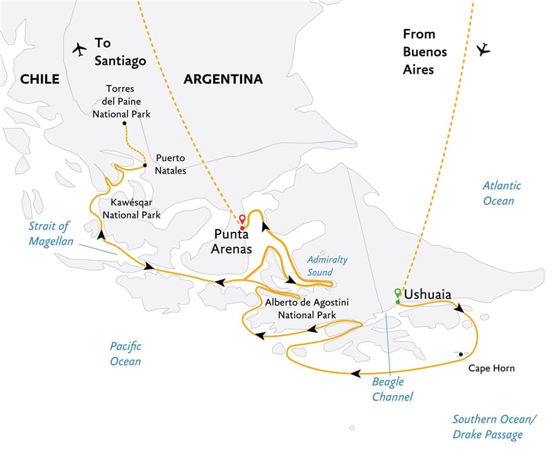 Po dobrodružném dvoutýdenním průzkumu se rozloučíte s expedičním týmem, vystoupíte v Punta Arenas a necháte se převézt na letiště k charterovému letu do Santiaga, odkud můžete pokračovat v cestě nebo přestoupit na let domů.