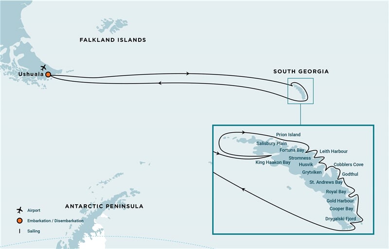 Zátoka krále Haakona - britský badatel Ernest Shackleton dorazil do zátoky krále Haakona během své cesty dlouhé 800 námořních mil na otevřeném člunu "James Caird" ze Sloního ostrova. Odtud přeplul do Stromness, aby požádal o pomoc při záchraně své výpravy na Sloním ostrově poté, co opustili Weddellovo moře, kde jejich loď rozdrtil led. Na plážích převládají tuleni sloní. Pozorovatelé ptáků budou vyhlížet dudky jihogeorgijské, priony antarktické a také potápky a modré buřňáky.
