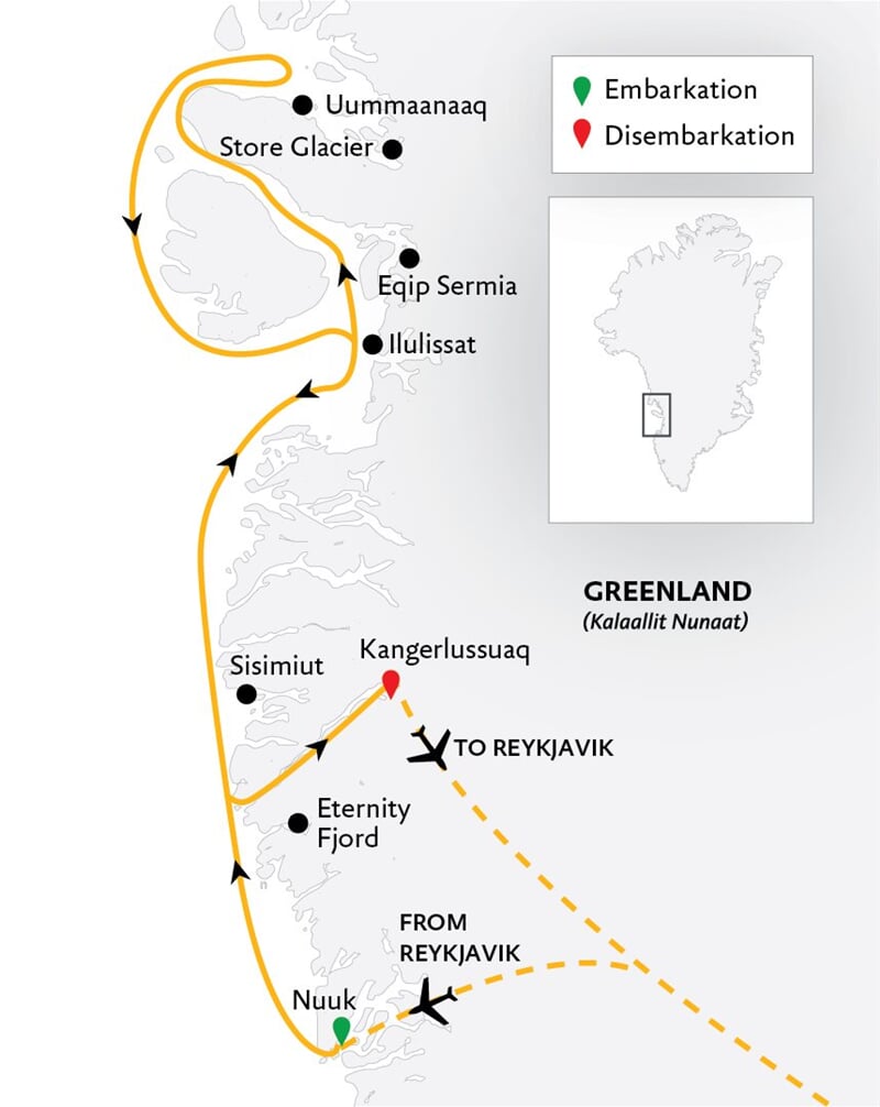 Naše 11denní expedice „Západní Grónsko: Objevování obrovských ledovců a inuitských komunit, směr na sever“ je určena pro cestovatele, kteří touží po co nejintenzivnějším zážitku ze západního Grónska – kde přílivové ledovce, legendární fjordy, kolosální ledovce a malebné pobřežní komunity oživují ducha této oblasti. Vyrazíte hluboko do fjordu Eternity i do zřídka navštěvovaného fjordu Itilleq. Prozkoumáte také Ilulissat, Eqip Sermia a Uummannaq – klenoty západního Grónska z ledu a kamene – a to vše v rámci jedné plynulé cesty. A díky našim partnerstvím s místními obyvateli vás zavedeme za hranice turistických průvodců a spojíme vás s Grónskem prostřednictvím těch, kteří ho nazývají svým domovem. Navíc překročíte ikonický polární kruh.